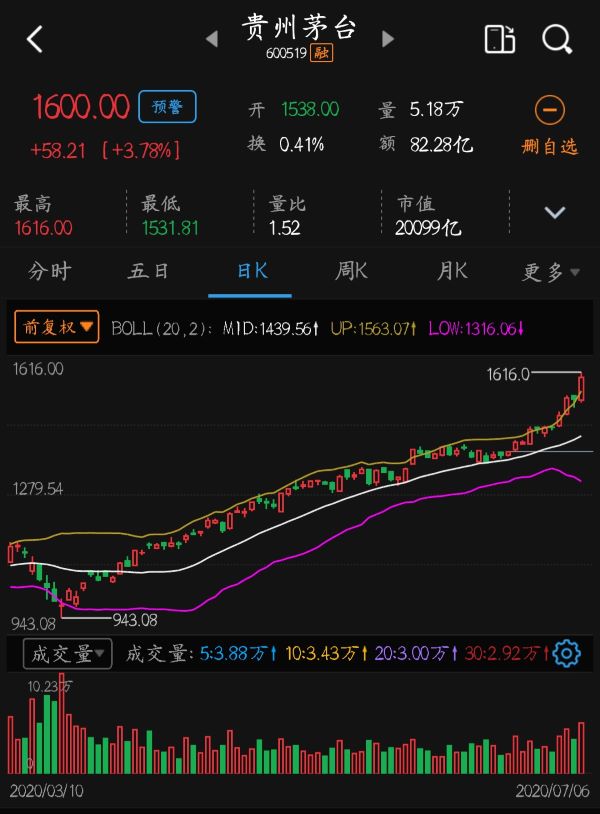 市值龙头老大,贵州茅台从3月19日的940多涨到1600,用了不到4个月,估价上涨70%。